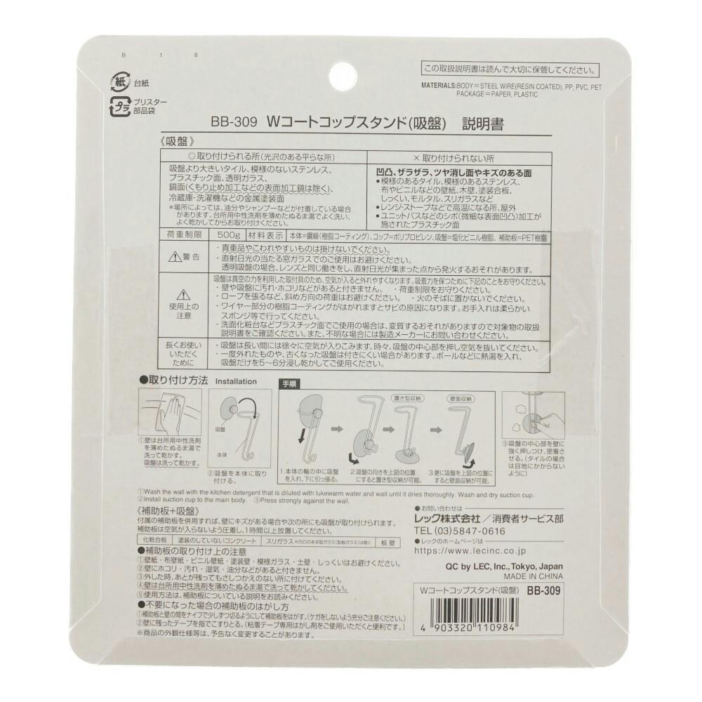 ●本体/鋼線(樹脂コーティング) ●コップ/ポリプロピレン ●吸盤/塩化ビニル樹脂(補助板付き) ●補助板/PET樹脂