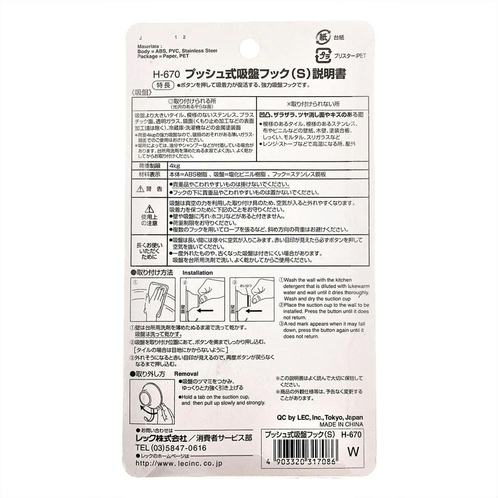 プッシュ式吸盤フック S H-670