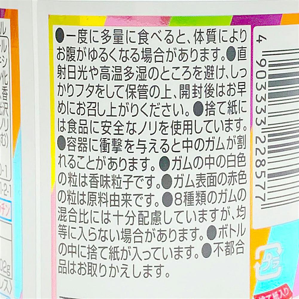 マルチトール(外国製造、国内製造)、植物油脂/甘味料(キシリトール、アスパルテーム・L-フェニルアラニン化合物)、ガムベース、増粘剤(アラビアガム)、香料、ビタミンC、リン酸一水素カルシウム、光沢剤、着色料(フラボノイド、クチナシ)、フクロノリ抽出物、等