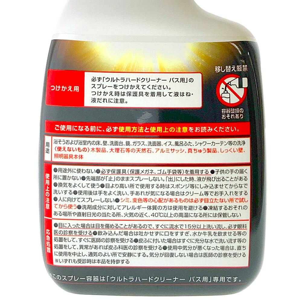 ●必ず「ウルトラハードクリーナー バス用」のスプレーをつけかえてください。●つけかえ時は保護具を着用して液はね・液だれに注意。