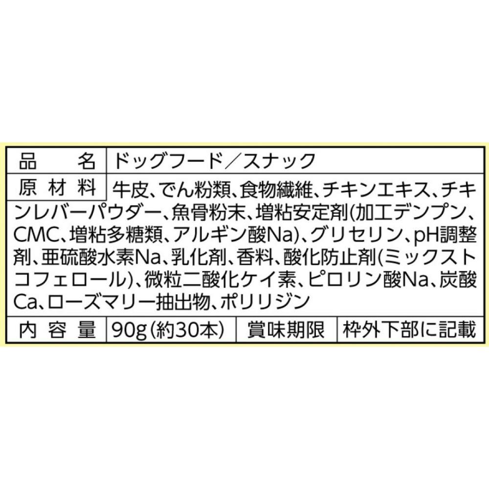 牛皮、でん粉類、食物繊維、チキンエキス、チキンレバーパウダー、魚骨粉末、増粘安定剤(加工デンプン、CMC、増粘多糖類、アルギン酸Na)、グリセリン、pH調整剤、亜硫酸水素Na、乳化剤、香料、酸化防止剤(ミックストコフェロール)、微粒二酸化ケイ素、その他