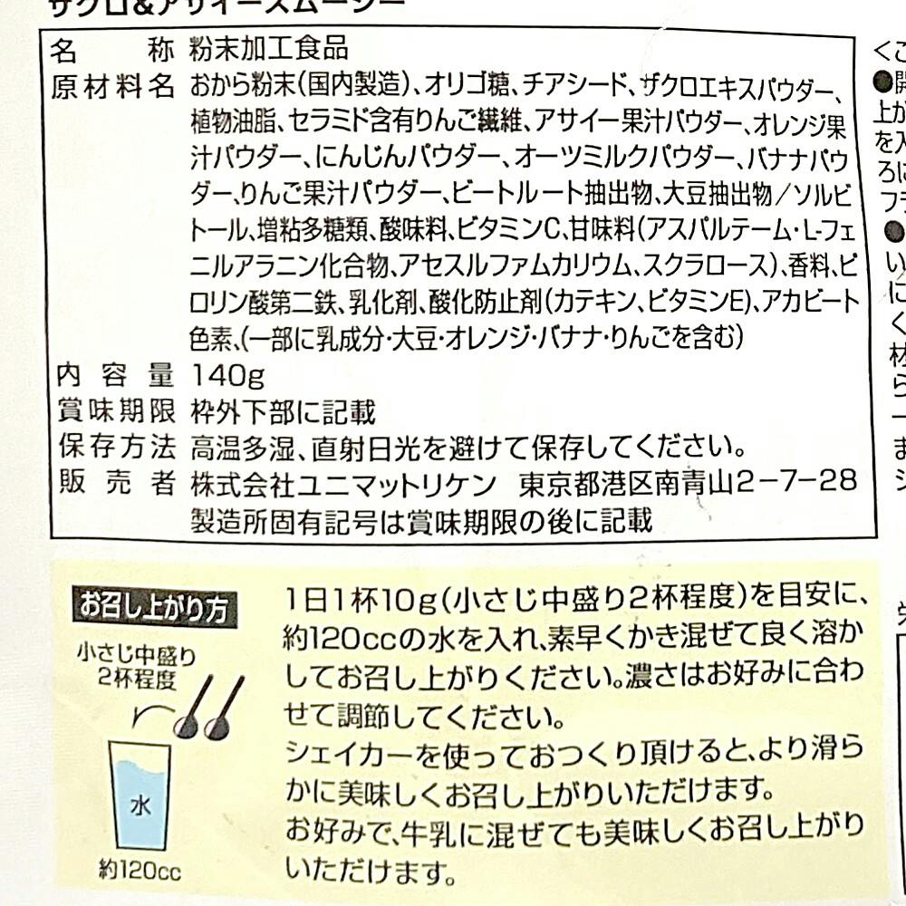 おから粉末(国内製造)、オリゴ糖、チアシード、ザクロエキスパウダー、植物油脂、セラミド含有りんご繊維、アサイー果汁パウダー、オレンジ果汁パウダー、にんじんパウダー、オーツミルクパウダー、バナナパウダー、りんご果汁パウダー、ビートルート抽出物、など
