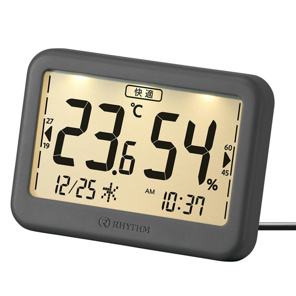 高精度で温度湿度を測定し、環境注意表示ができる時計。給電時はバックライトが点灯