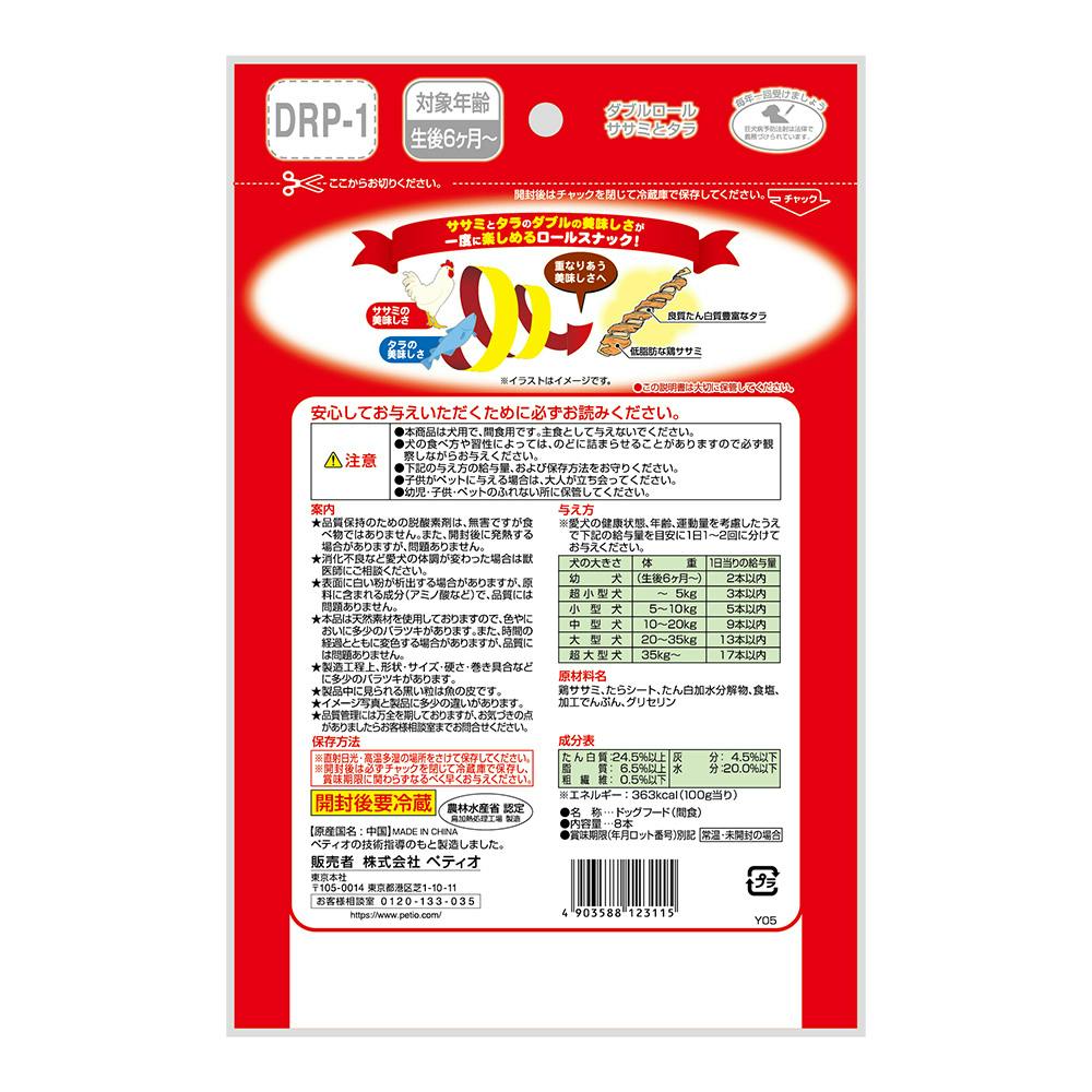 ササミとタラの2つの素材でダブルの美味しさ!手に持って食べやすい! ササミとタラのダブルの美味しさが一度に楽しめるロールスナック!低脂肪な鶏ササミ、良質たん白質豊富なタラの重なり合う美味しさ。