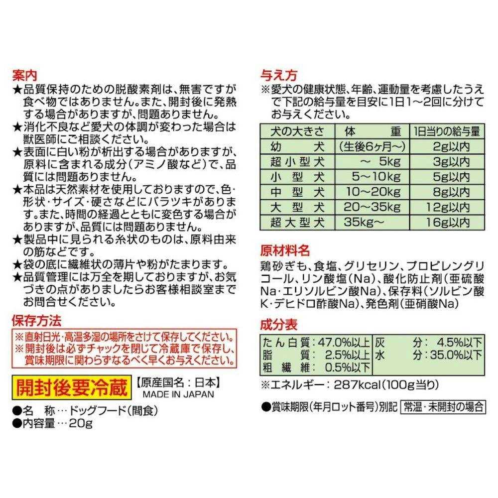 鶏砂ぎも、食塩、グリセリン、プロピレングリコール、リン酸塩(Na)、酸化防止剤(亜硫酸Na・エリソルビン酸Na)、保存料(ソルビン酸K・デヒドロ酢酸Na)、発色剤(亜硝酸Na)