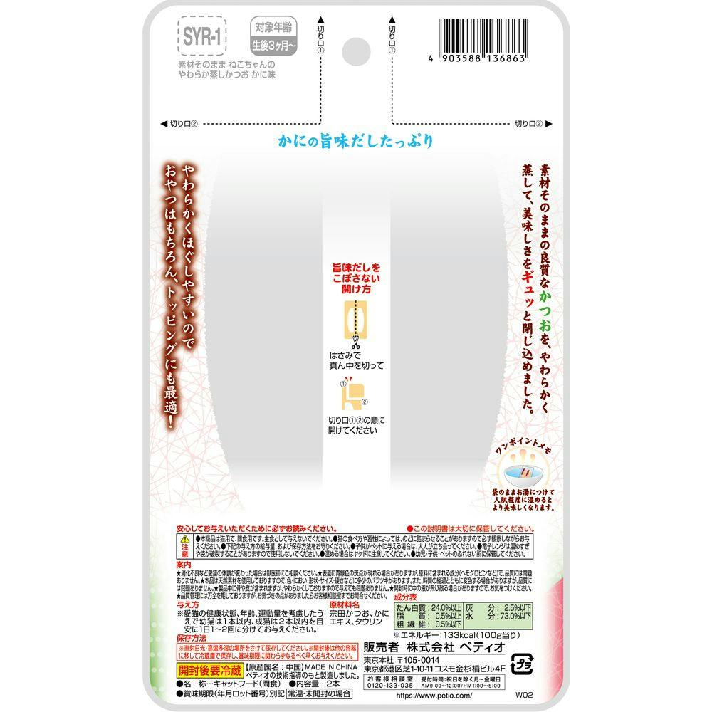 かにの旨味だしたっぷり。素材そのままの良質なかつおを、やわらかく蒸して、美味しさをギュッと閉じ込めました。やわらかくほぐしやすいので、おやつはもちろん、トッピングにも最適!猫ちゃんの健康維持にタウリン配合。2つに分けて保存できる。着色料 不使用。