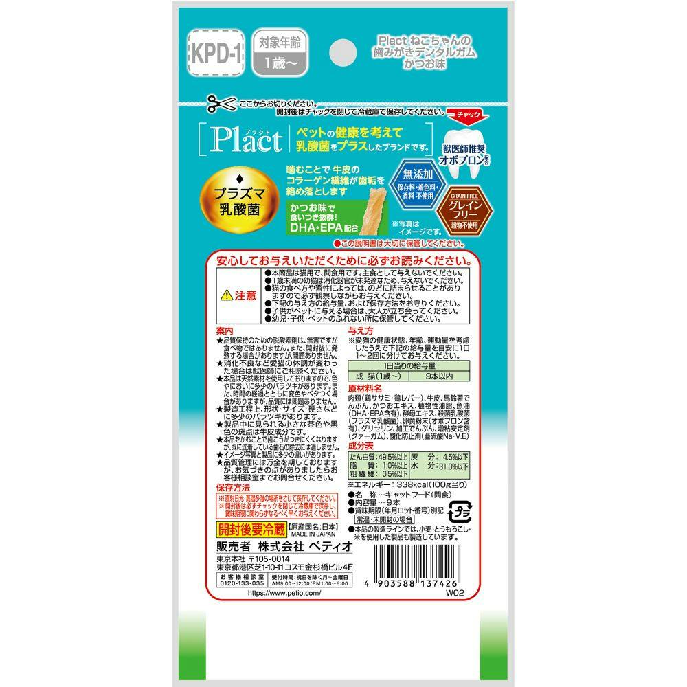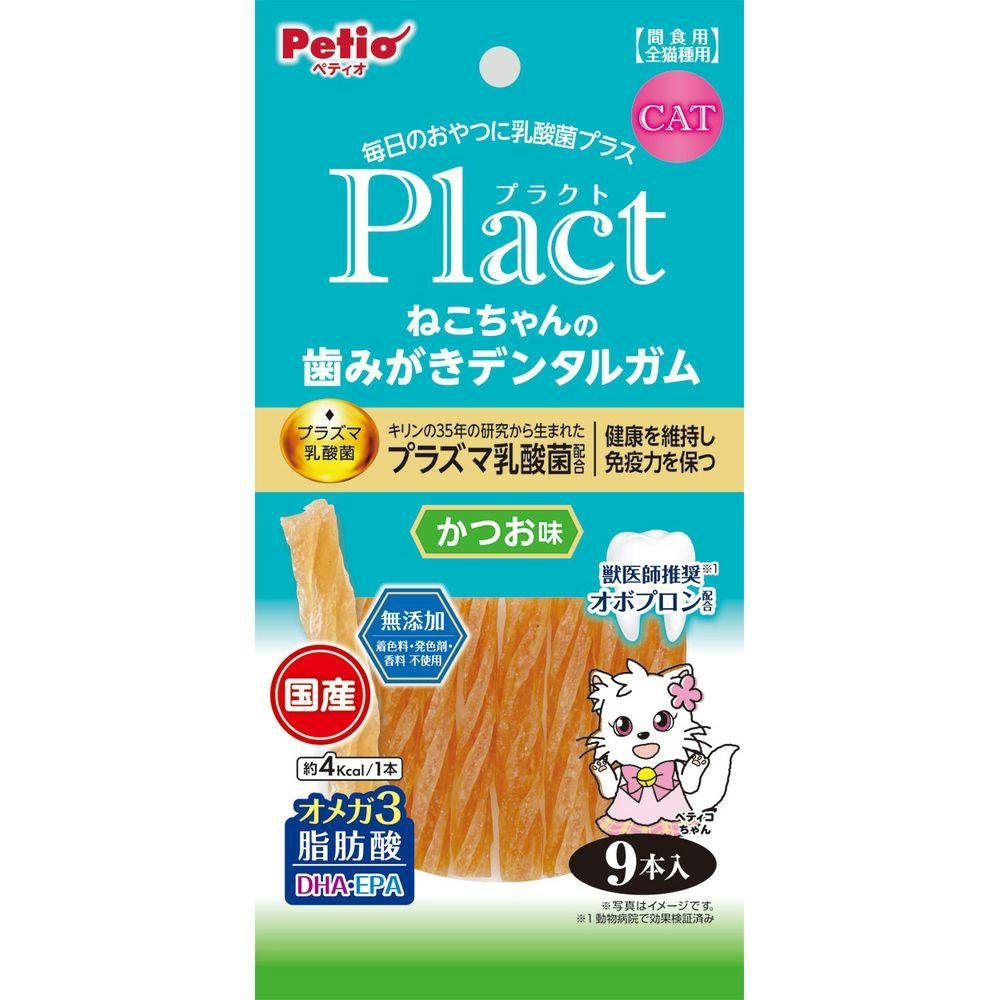 Plactはペットの健康を考えて乳酸菌をプラスしたブランドです。噛むことで牛皮のコラーゲン繊維が歯垢をからめて落とします。かつお味で食いつき抜群!グレインフリーだからネコちゃんの健康サポート・食物アレルギーケアができる。保存料・着色料・香料無添加。
