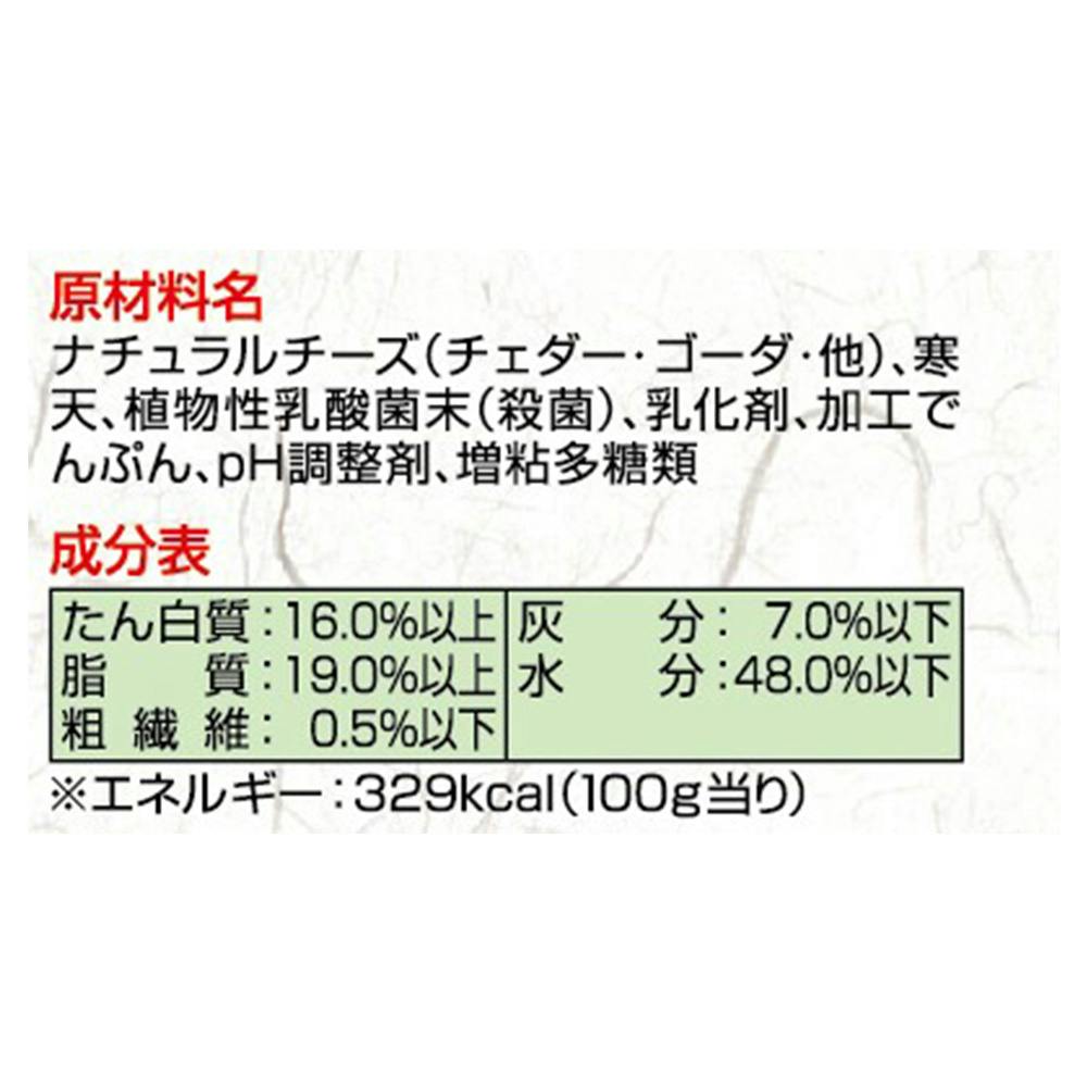 ナチュラルチーズ(チェダー・ゴーダ・他)、寒天、植物性乳酸菌末(殺菌)、乳化剤、加工でんぷん、pH調整剤、増粘多糖類