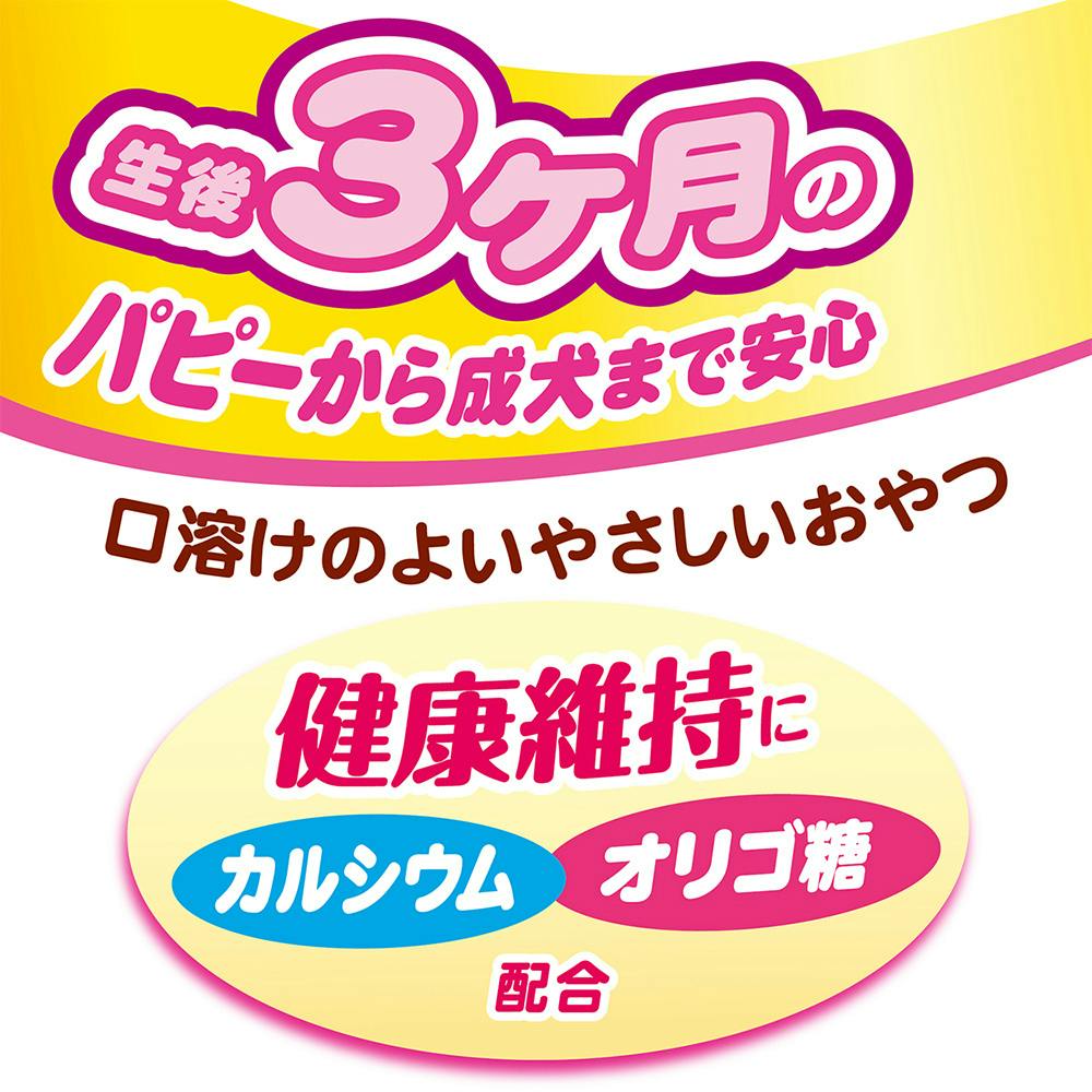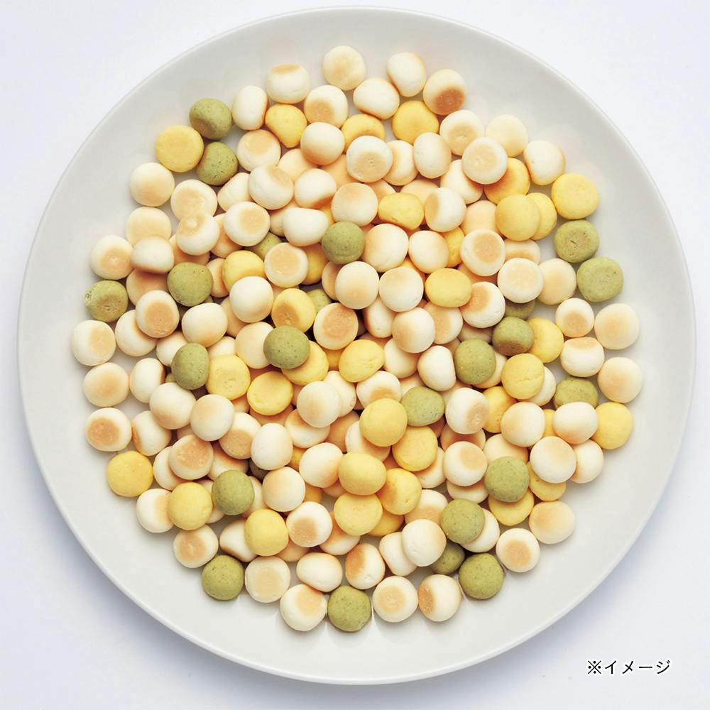 生後3ヶ月のパピーから与えられます。からだにうれしい砂糖50%オフ(当社「体にうれしい ボーロちゃん 乳酸菌入り」比)&カルシウム・オリゴ糖配合。β-カロテン豊富なかぼちゃと鉄分豊富なほうれん草入り。小麦粉・牛乳・保存料・着色料不使用。