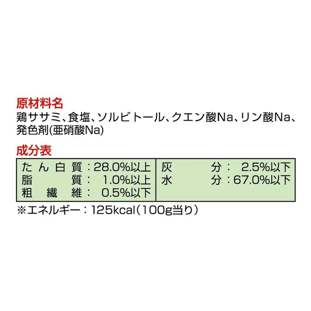 鶏ササミ、食塩、ソルビトール、クエン酸Na、リン酸Na、発色剤(亜硝酸Na)