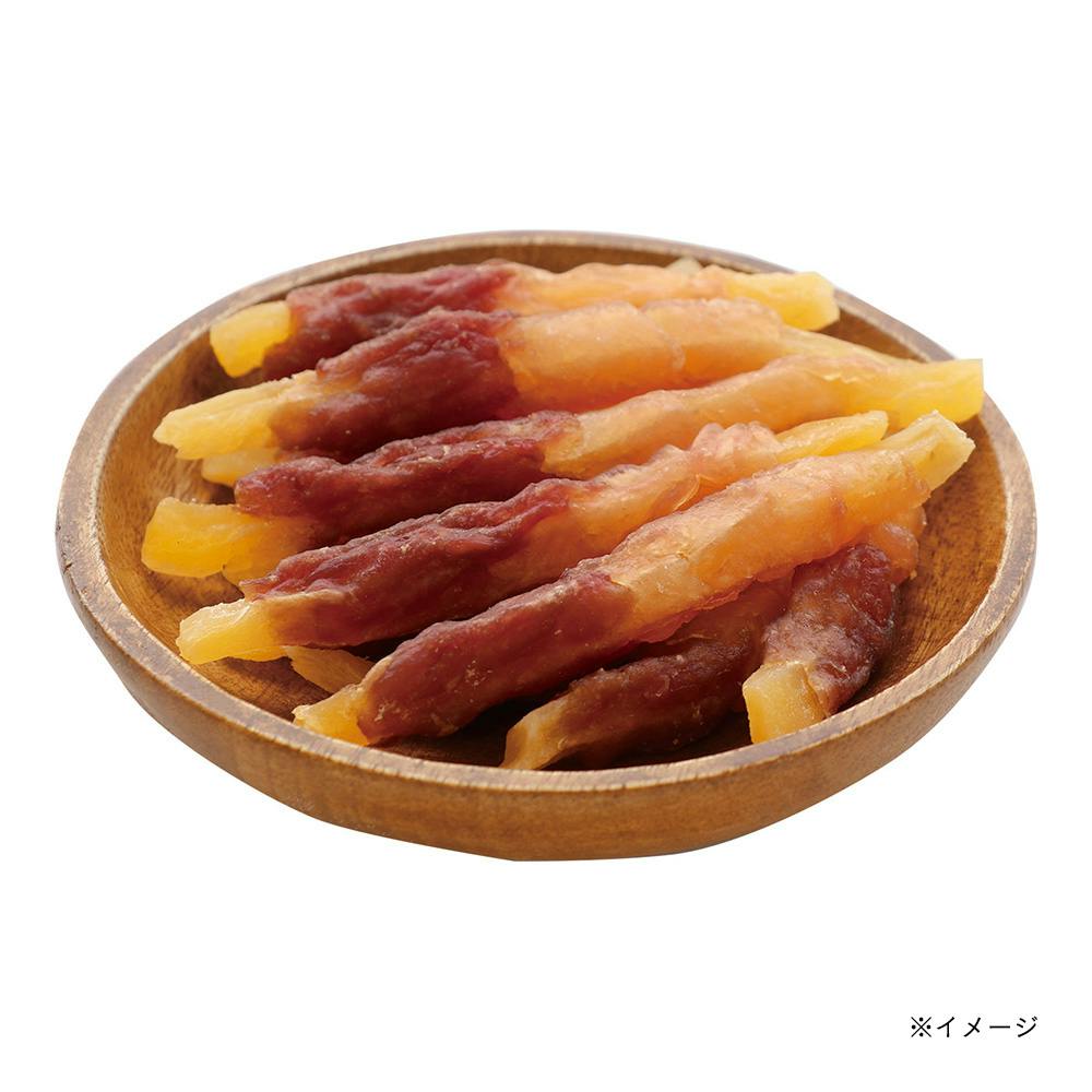 食物センイたっぷり細切りおいもに低脂肪な鶏ササミと味わい深い砂ぎもを巻いて小型犬にもぴったりなやわらかさ・サイズに仕上げました。着色料・香料不使用。農林水産省認定 鳥加熱処理工場製造。