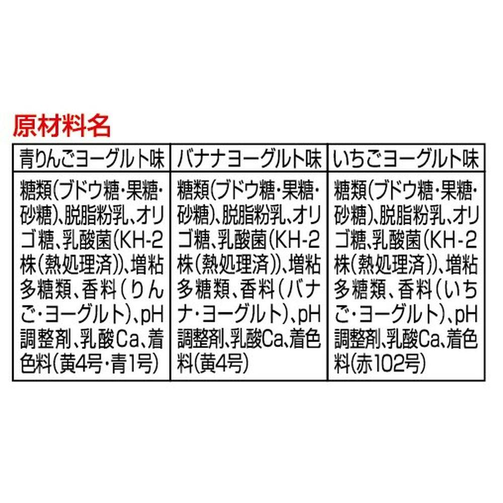糖類(ブドウ糖・果糖・砂糖)、脱脂粉乳、オリゴ糖、乳酸菌(KH-2株(熱処理済))、増粘多糖類、香料(りんご・ヨーグルト)、pH調整剤、乳酸Ca、着色料(黄4号・青1号)、他