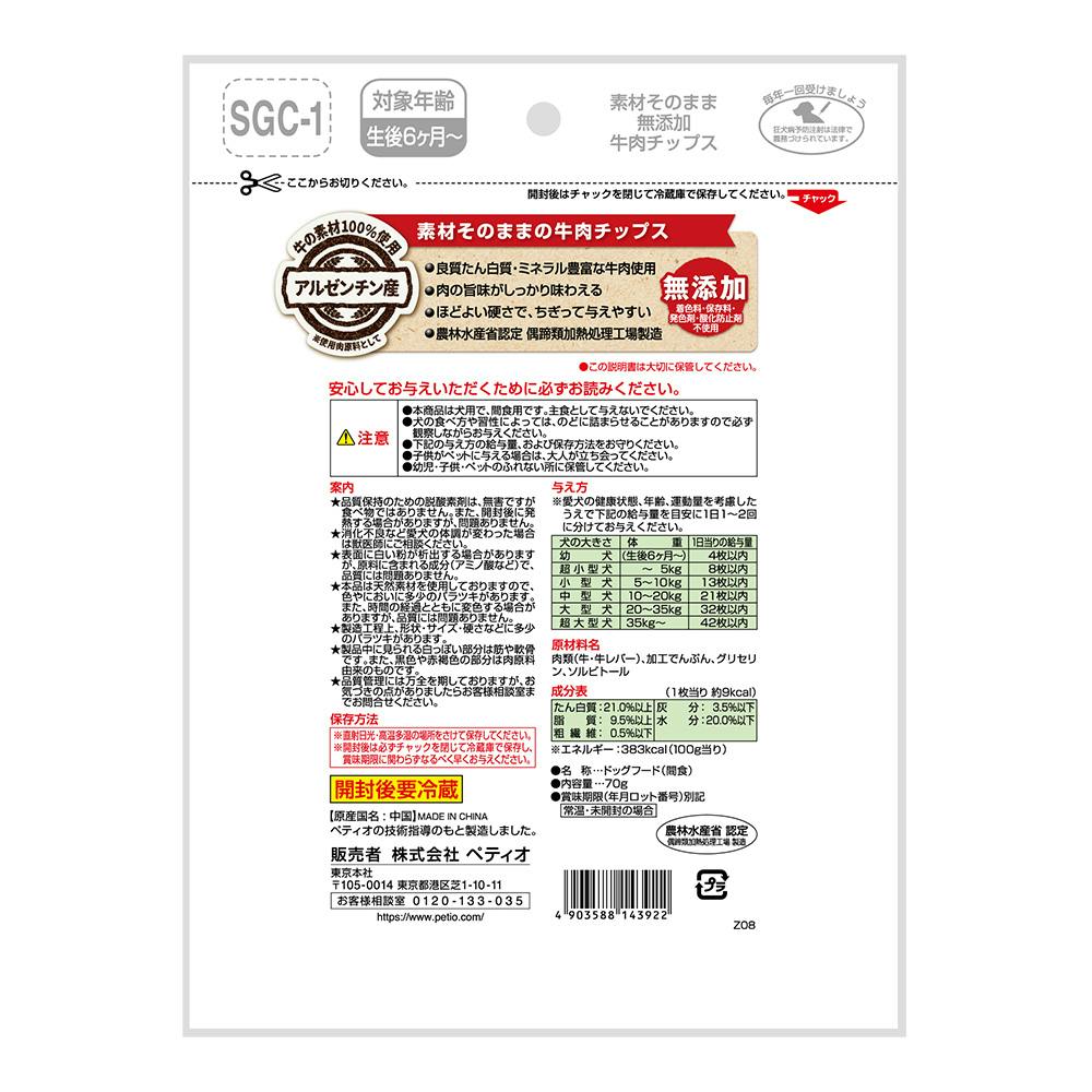 良質たん白質・ミネラル豊富な牛肉使用。肉の旨味がしっかり味わえる。ほどよい硬さで、ちぎって与えやすいチップス形状。着色料・保存料・発色剤・酸化防止剤無添加。農林水産省認定 偶蹄類加熱処理工場製造。