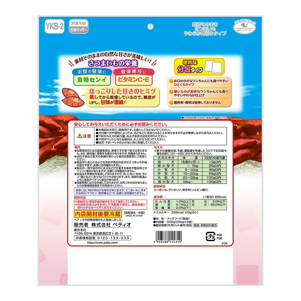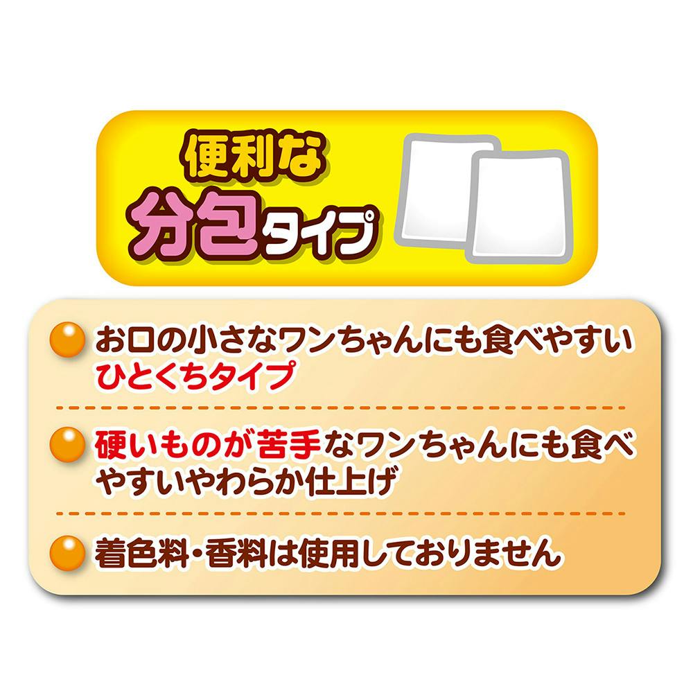 食物センイやビタミンC・Eを含むさつまいもを蒸してから乾燥しているので、糖度がUPし甘みが濃縮されています。お口の小さなワンちゃんにも食べやすいひとくちタイプで、硬いものが苦手なワンちゃんにも食べやすいやわらか仕上げ。着色料・香料無添加。便利な2袋分包。