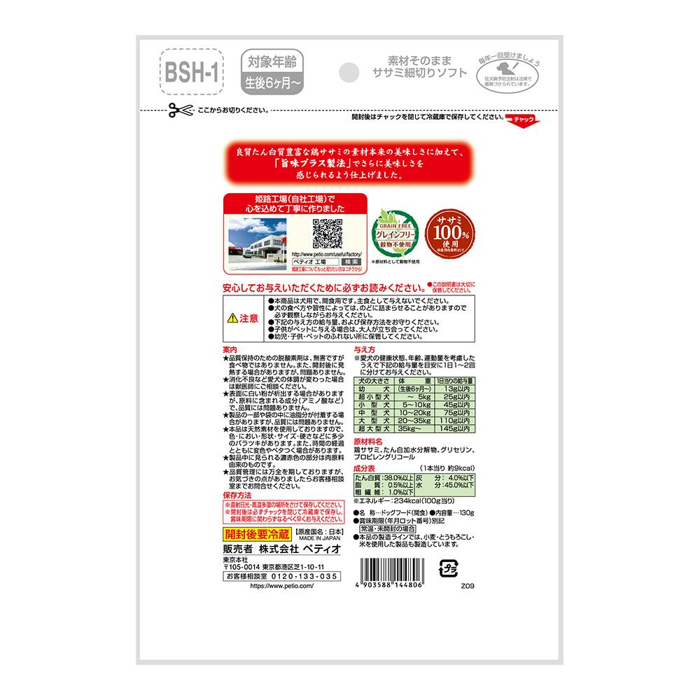 良質たん白質豊富な鶏ササミを100%使用(使用肉原料として)。「旨味プラス製法」でさらに美味しさを感じられるよう仕上げました。小型犬・シニア犬にも食べやすいやわらか食感の細切りタイプ。姫路工場(自社工場)で心を込めて丁寧に作りました。便利な2袋分包。