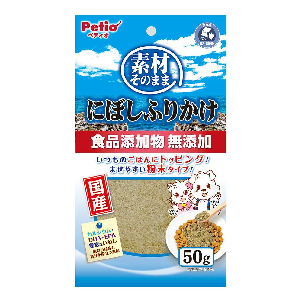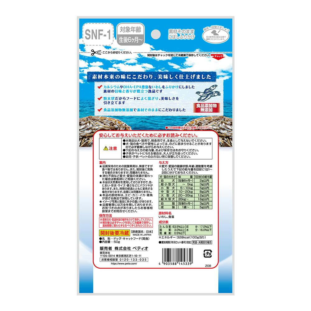 食品添加物無添加で素材そのまま。粉末状だからフードに良く混ざり、美味しさを引き立てます。カルシウム・DHA・EPA豊富ないわしを使用。