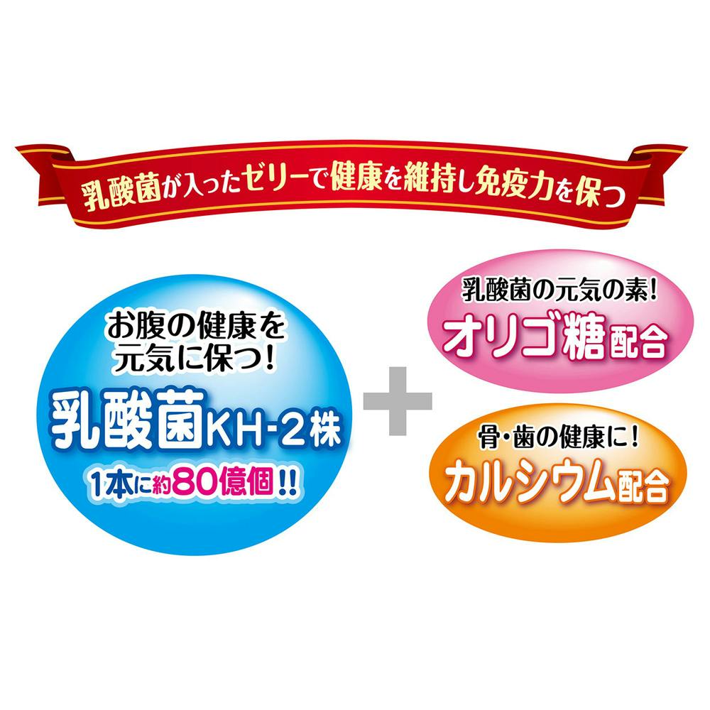 お腹の健康を元気に保つ乳酸菌KH-2株とオリゴ糖、骨・歯の健康に配慮したカルシウムが入ったゼリー。夏の暑い時期には冷やしてゼリーとして、また凍らせてシャーベットとしても与えられるから毎日の水分補給にピッタリ!1本たったの約3kcal。