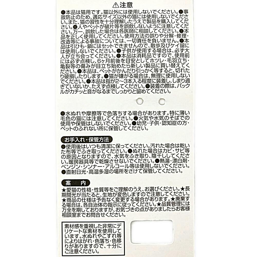 ●本品は猫用です。猫以外には使用しないでください。●事故防止のため適応サイズ以外の猫には使用しないでください。また猫の習性を十分理解したうえで製品を購入してください。●人やペットが破片等を誤飲しないように注意してください。など