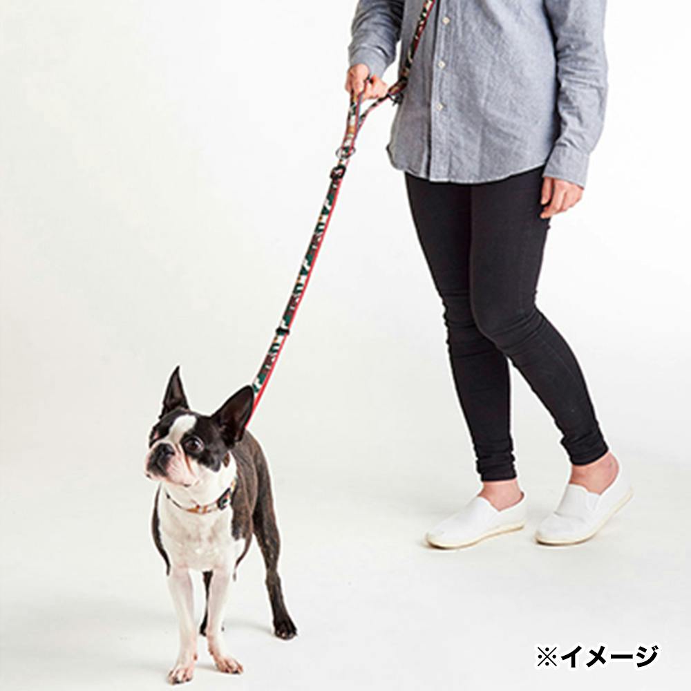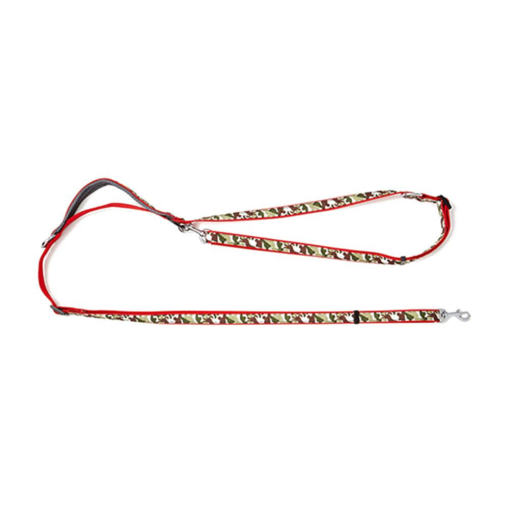 リサイクルポリエステルを使用し、抗菌加工を行った生地を使用。撥水加工で汚れが落ちやすい。これ一本で様々な使い方が可能で、「ショルダーリード」「通常リード」「2頭引きリード」「仮つなぎ」ができる。人気の迷彩柄。