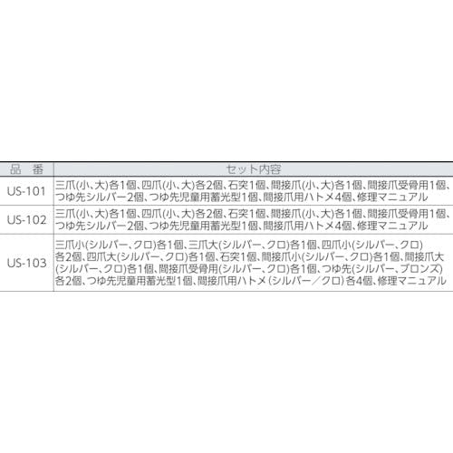 三爪:スチール●四爪:スチール●石突き:ポリプロピレン(PP)●間接爪:スチール●間接爪受骨用:スチール●つゆ先シルバー:スチール●つゆ先児童用蓄光型:ポリプロピレン(PP)●補修シ―ト:ポリエチレン