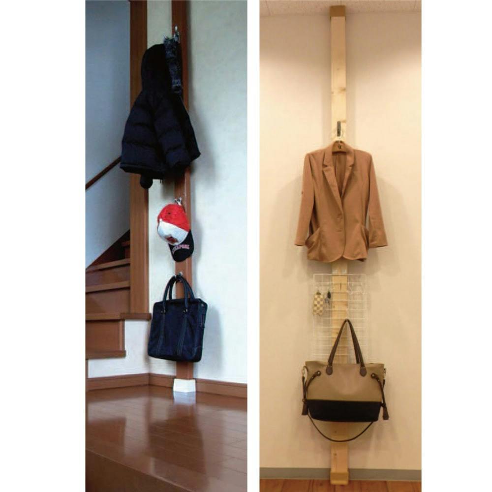 市販のツーバイフォー材(断面約38mmX89mm)を使用し、お好みのフックやネジ等で時計、額縁、カレンダー等を取り付けることが出来ます。