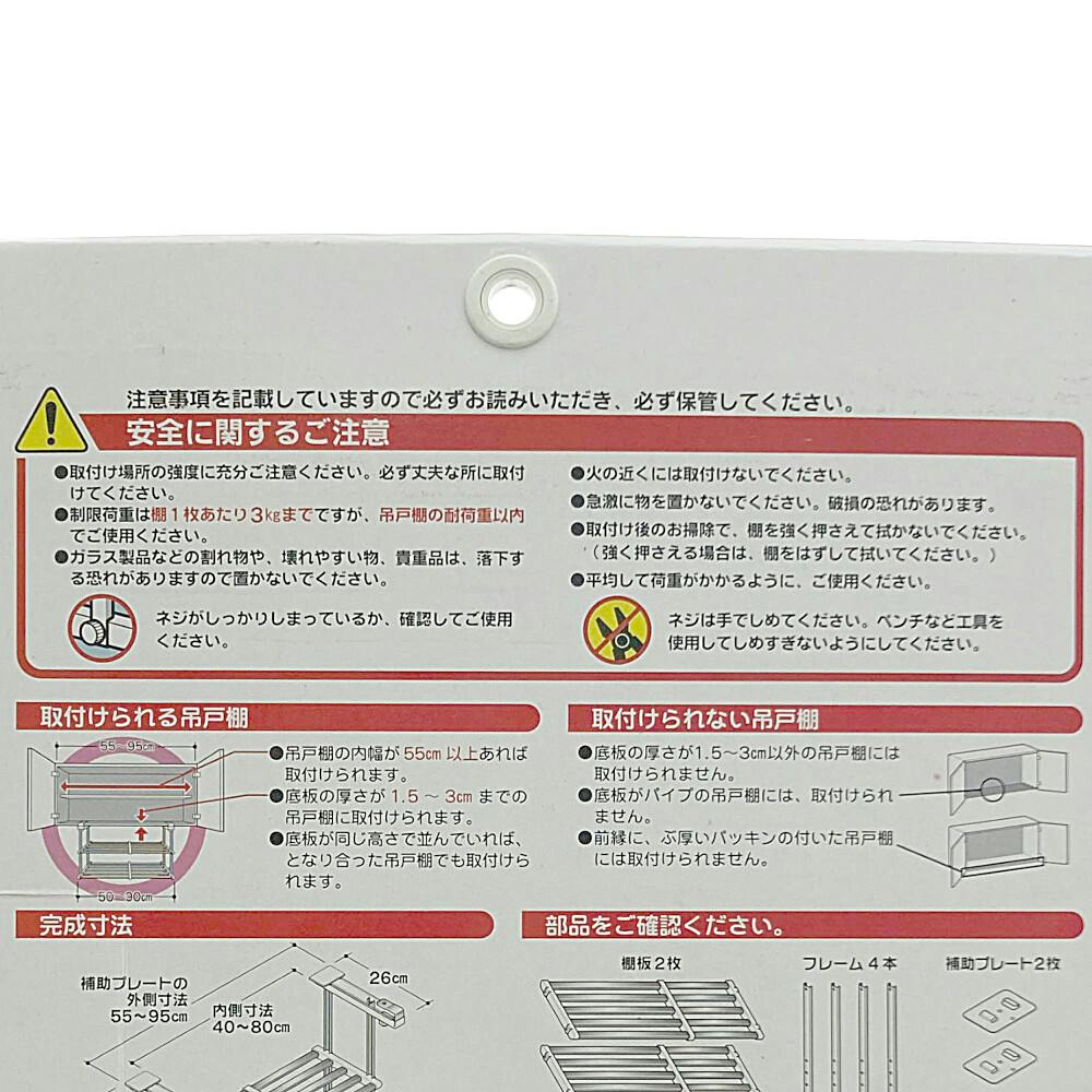 ●取付け場所の強度に充分ご注意ください。必ず丈夫な所に取付けてください●制限荷重は棚1枚あたり3kgまでですが吊戸棚の耐荷重以内でご使用ください●ガラス製品などの割れ物や壊れやすい物貴重品は落下する恐れがありますので置かないでください