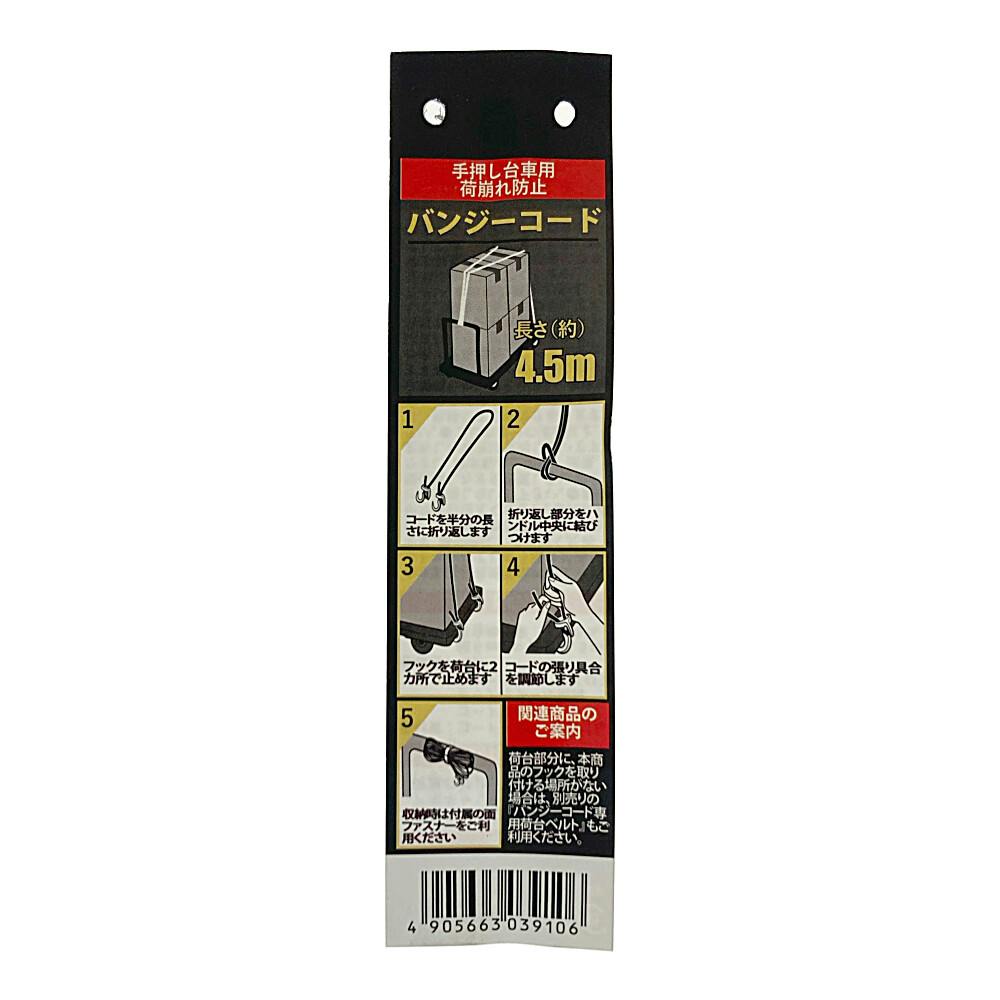 ●手押し台車用荷崩れ防止●コード許容伸び率:150%●荷台部分に、本商品のフックを取り付ける場所がない場合は、別売りの「バンジーコード専用荷台ベルト」もご利用ください。