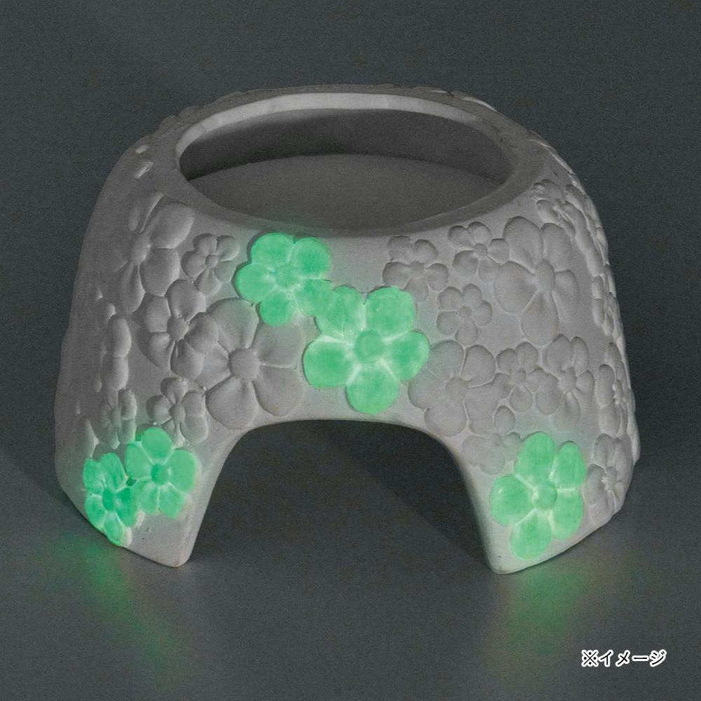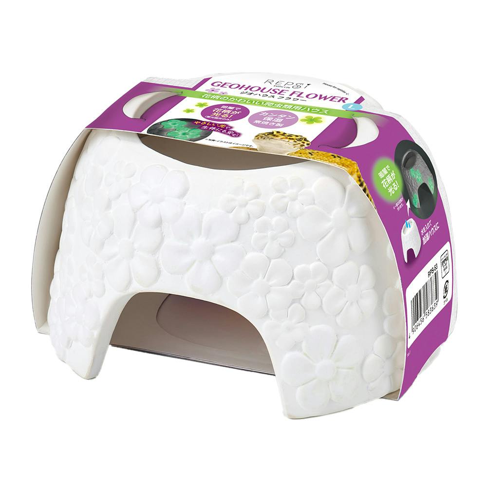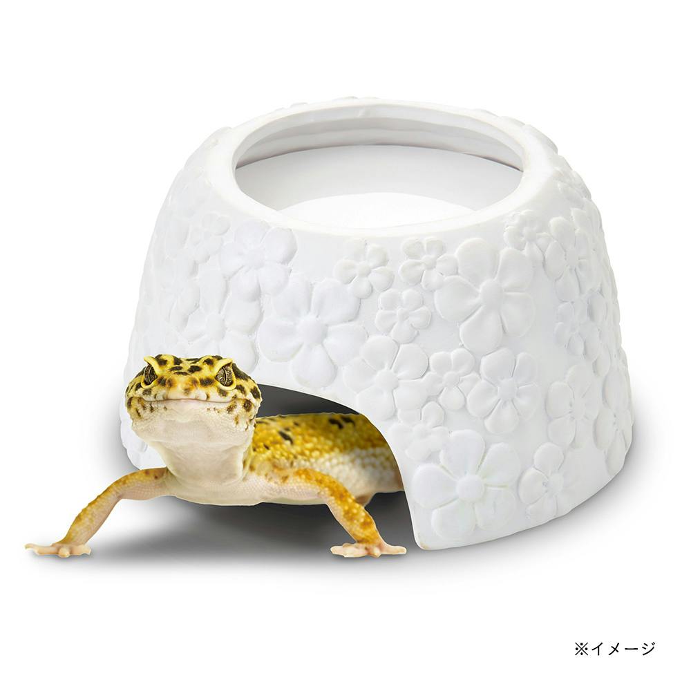 ●明るいところで光を蓄えた花柄が、暗闇でぽわっとほのかに光るシェルターです。(蓄光箇所のみ)●やさしい光なので夜行性の爬虫類にも安心です。●多孔質の素焼きは水をよく吸い込み、ハウス内や飼育環境の湿度を快適に保ちます。