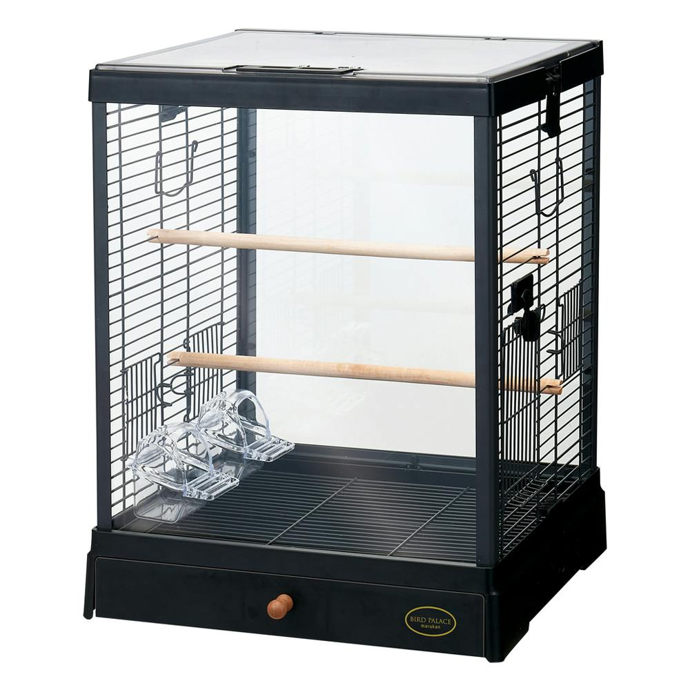 側面フェンス:スチール(粉体塗装) 底トレイ、引き出し:HIPS エサ入れ、水入れ:PS ガラスパネル:ガラス バックル:PP 側面扉ロック:ABS フェンス支柱:アルミ とまり木:天然木