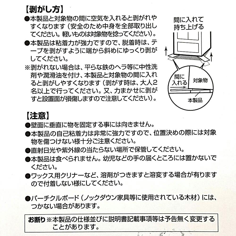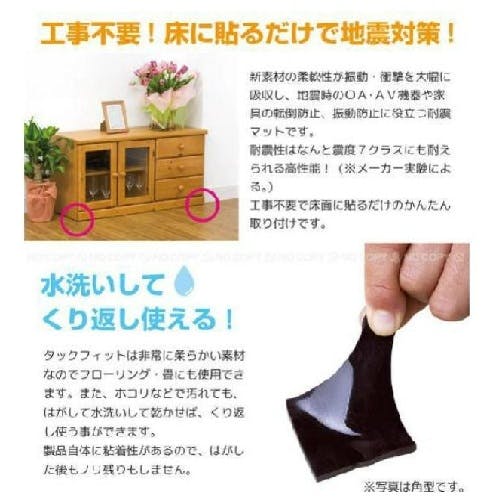 ●新素材の柔軟性が振動・衝撃を大幅に吸収し、地震などの転倒防止、制振効果に役立ちます ●貼るだけで簡単に設置できます(対象物の荷重に合わせてハサミでカットできます) ●非常に柔らかい素材ですので、フローリング畳に使用できます(畳は直に貼ってください)