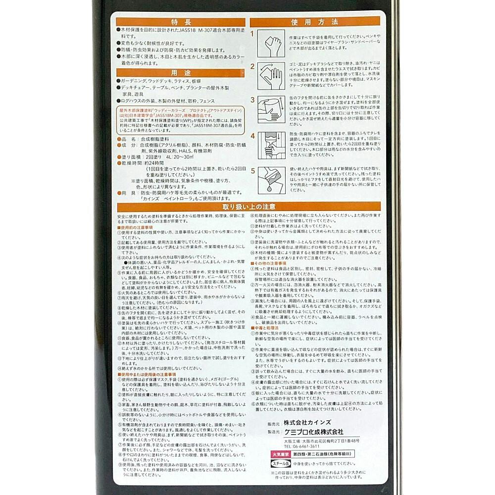 合成樹脂(アクリル樹脂)、顔料、木材防腐・防虫・防蟻剤、紫外線吸収剤、HALS、有機溶剤