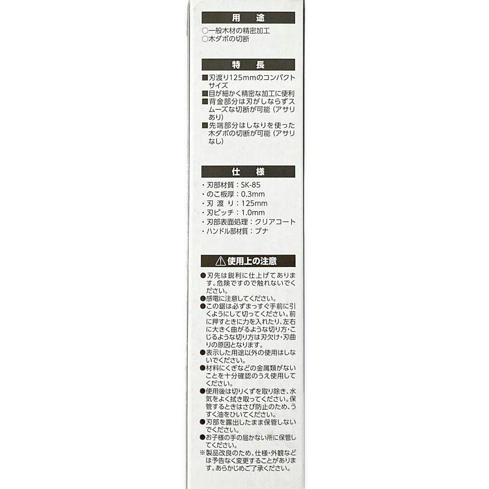 ●刃渡り125mmのコンパクトサイズ ●目が細かく精密な加工に便利 ●背金部分は刃がしならずスムーズな切断が可能(アサリあり) ●先端部分はしなりを使った木ダボの切断が可能(アサリなし)