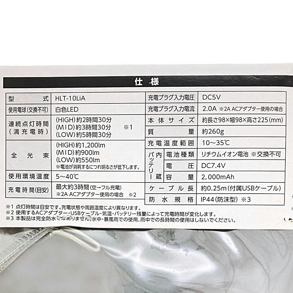 (HIGH)約1200lm、(MID)約900lm、(LOW)約550lm ※点灯時間は目安です。充電時間や周囲温度により異なります。