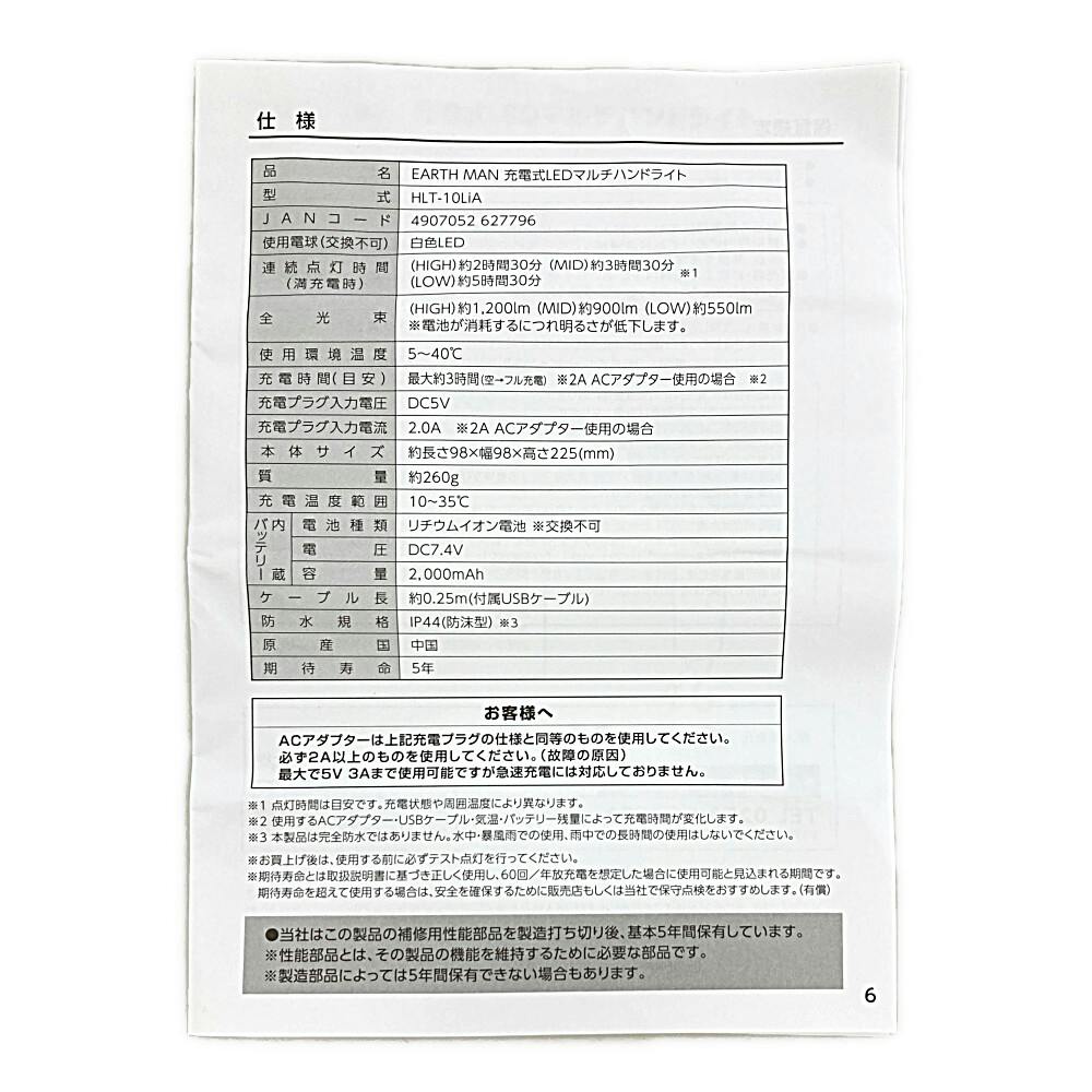 EARTH MAN 充電LEDハンドライト HLT-10LiA