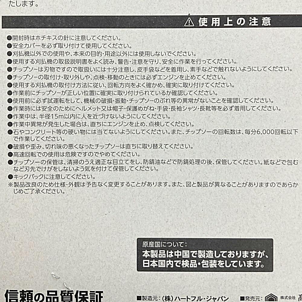 ●安全カバーを必ず取り付けて使用してください。●刈払機以外での使用や、本来の目的・用途以外には使用しないでください。●使用する前に刈払機の取扱説明書をよく読み、警告・注意を守り、安全に作業を行ってください。
