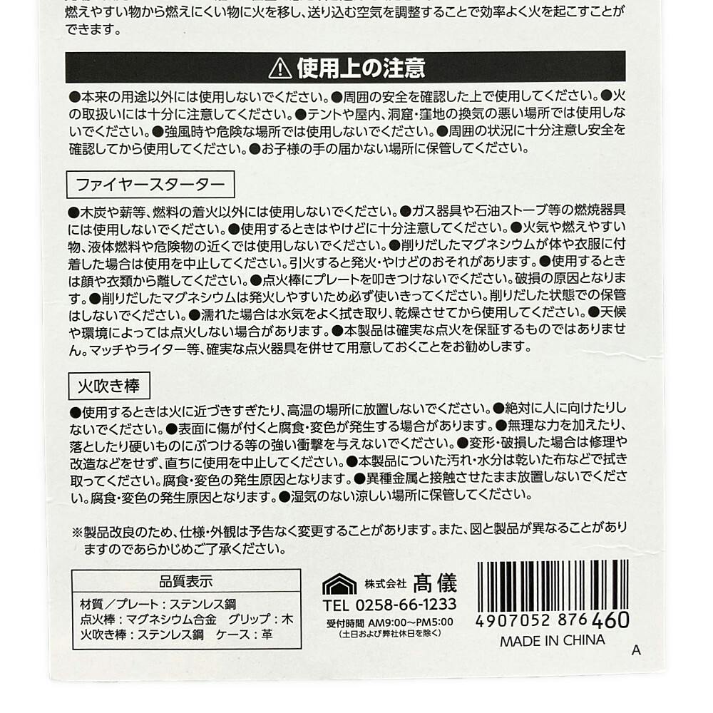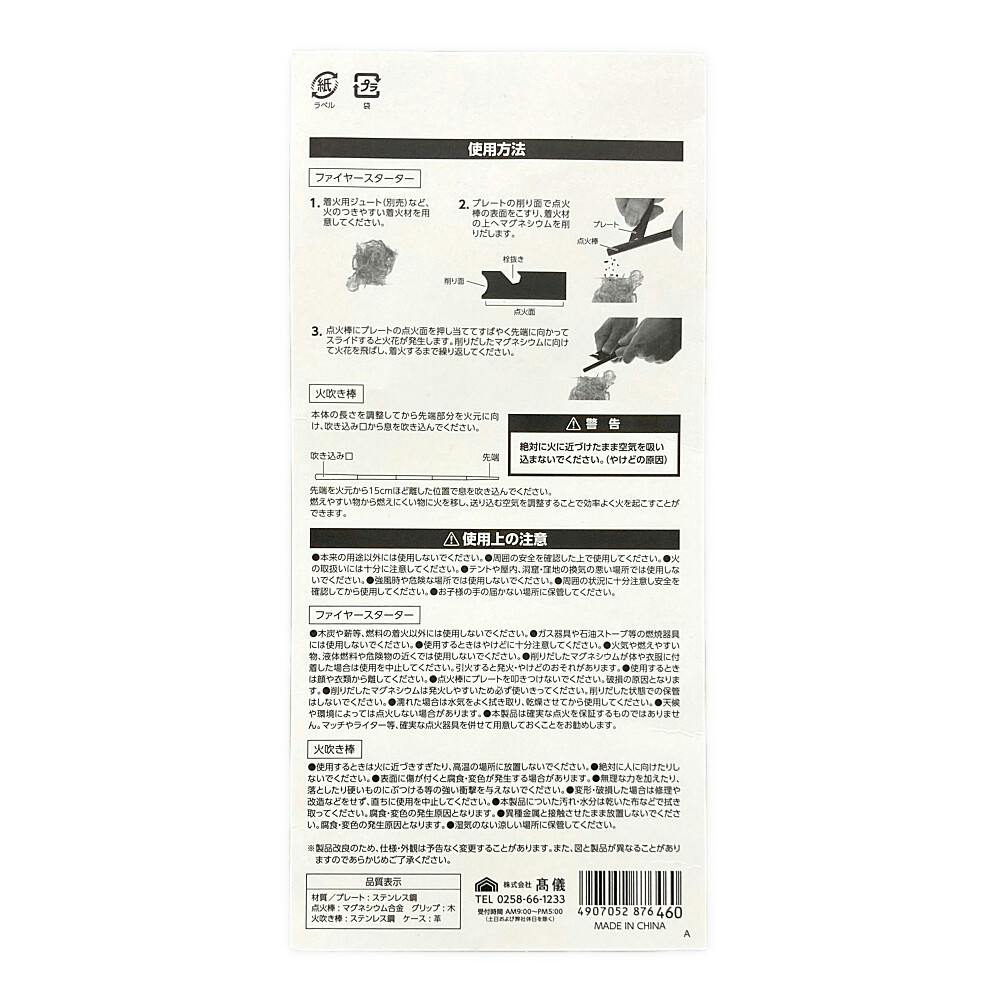 ●プレート・火吹き棒:ステンレス鋼 ●点火棒:マグネシウム合金 ●グリップ:木 ●ケース:革