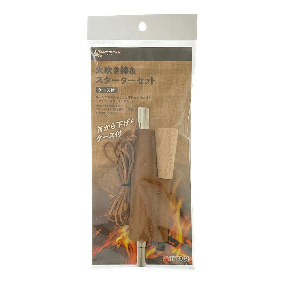 ●首から下げられるケースとファイヤースターターがついて便利 ●火吹き棒は伸縮式でコンパクトに持ち運びできる(15cmー60cm)