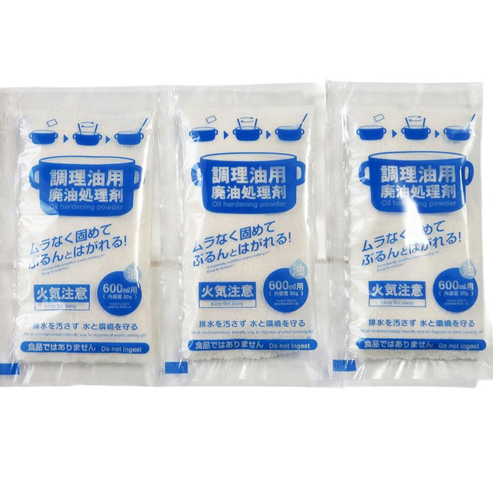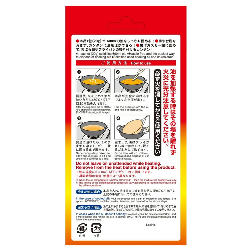 天ぷら油を捨てるとき、600mlの油に対して1包(20g)を混ぜて冷ますと、ゼリー状に固まり、燃えるゴミとして捨てられます。