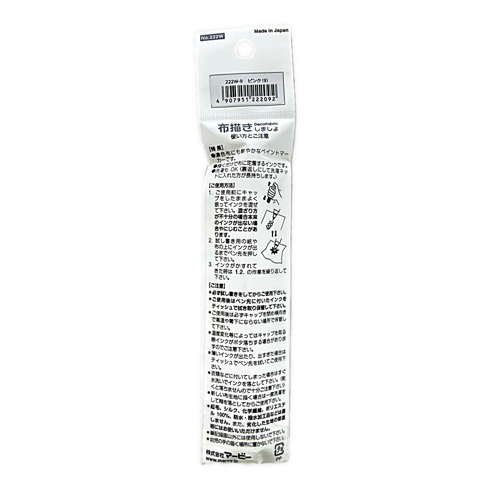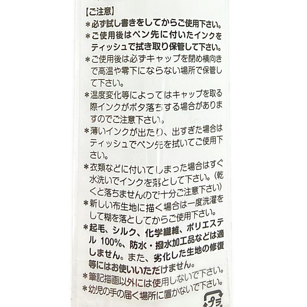●濃色布にも鮮やかなペイントマーカーです。●描くだけで布に定着するインクです。●洗濯もOK(裏返しにして洗濯ネットに入れた方が長持ちします。)●筆記幅/中字・約2mm