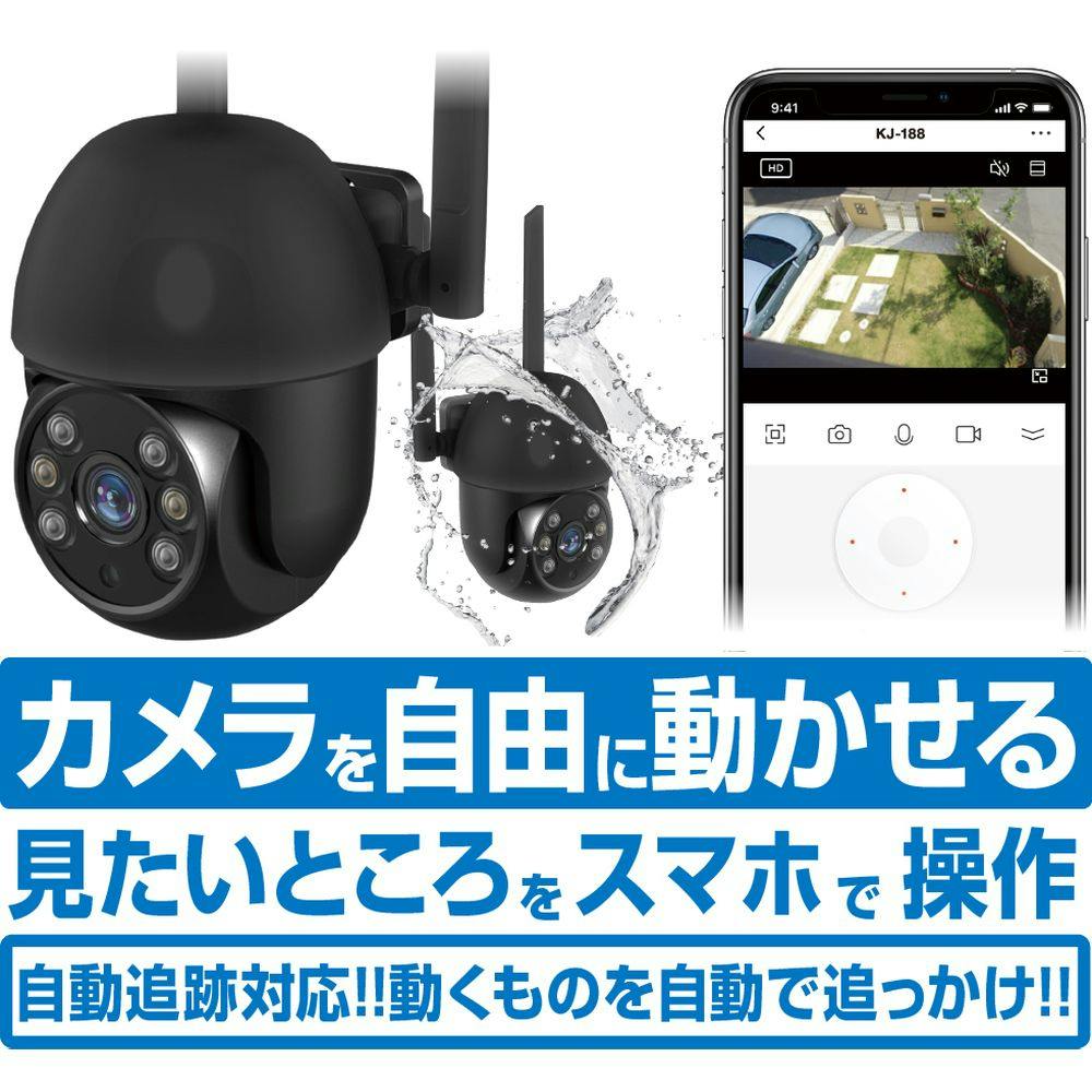 ●横310°縦140°首振機能●動くものを自動で追跡録画する自動追尾機能●300万画素●microSDカード128GB(別売)録画●赤外線暗視モード●動体センサー機能●防水等級IP65●双方向通話対応●最大16台のカメラを同時視聴可能※カメラの設置場所にWiFi環境が必要