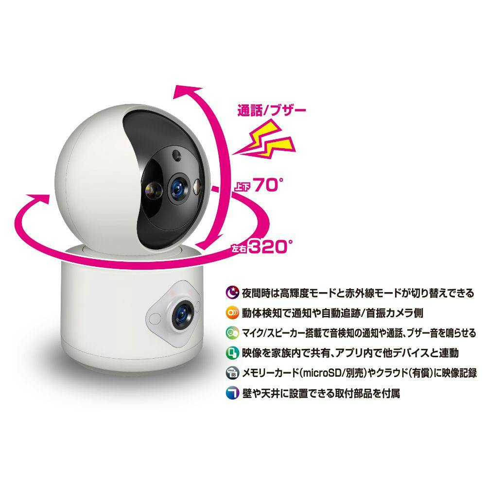 ●外出先からスマートフォンで室内をリアルタイムで確認できます。●首振り対応。※首振カメラ側のみ スマートフォン操作でカメラを自由に動かせるので見たいところに調節可能。(左右320°上下70°)●自動追跡機能。動くものを自動で追いかけます。