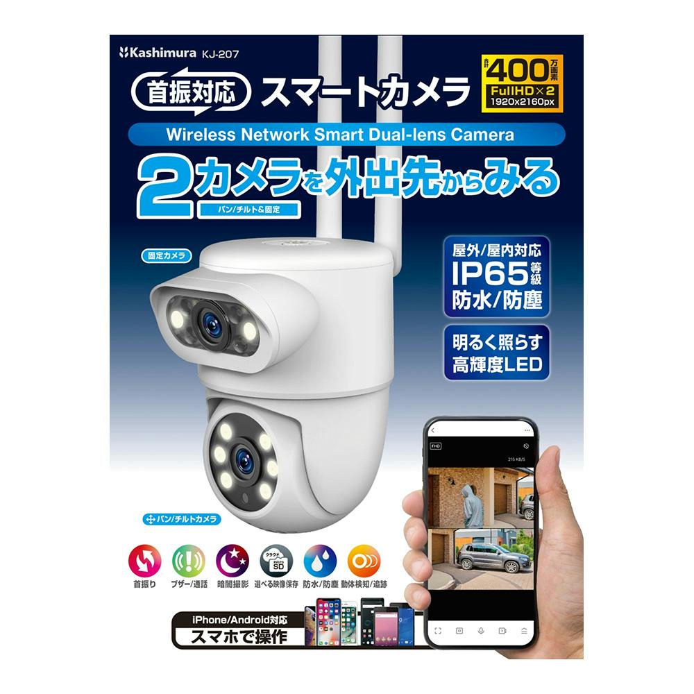 カシムラ スマートカメラ 2眼 防水 首振 照明 KJ-207 防犯カメラ 外出先スマホで映像確認可能 首振カメラ・固定カメラ搭載 屋外/屋内使用可能