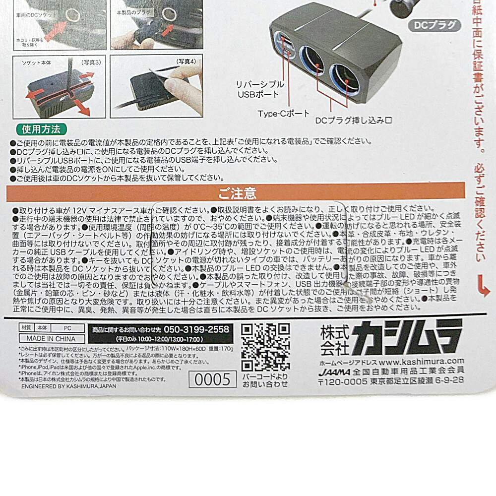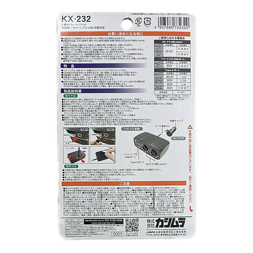 カシムラ 2連セパレートソケット PD20W リバーシブルUSB自動判定 KX-232