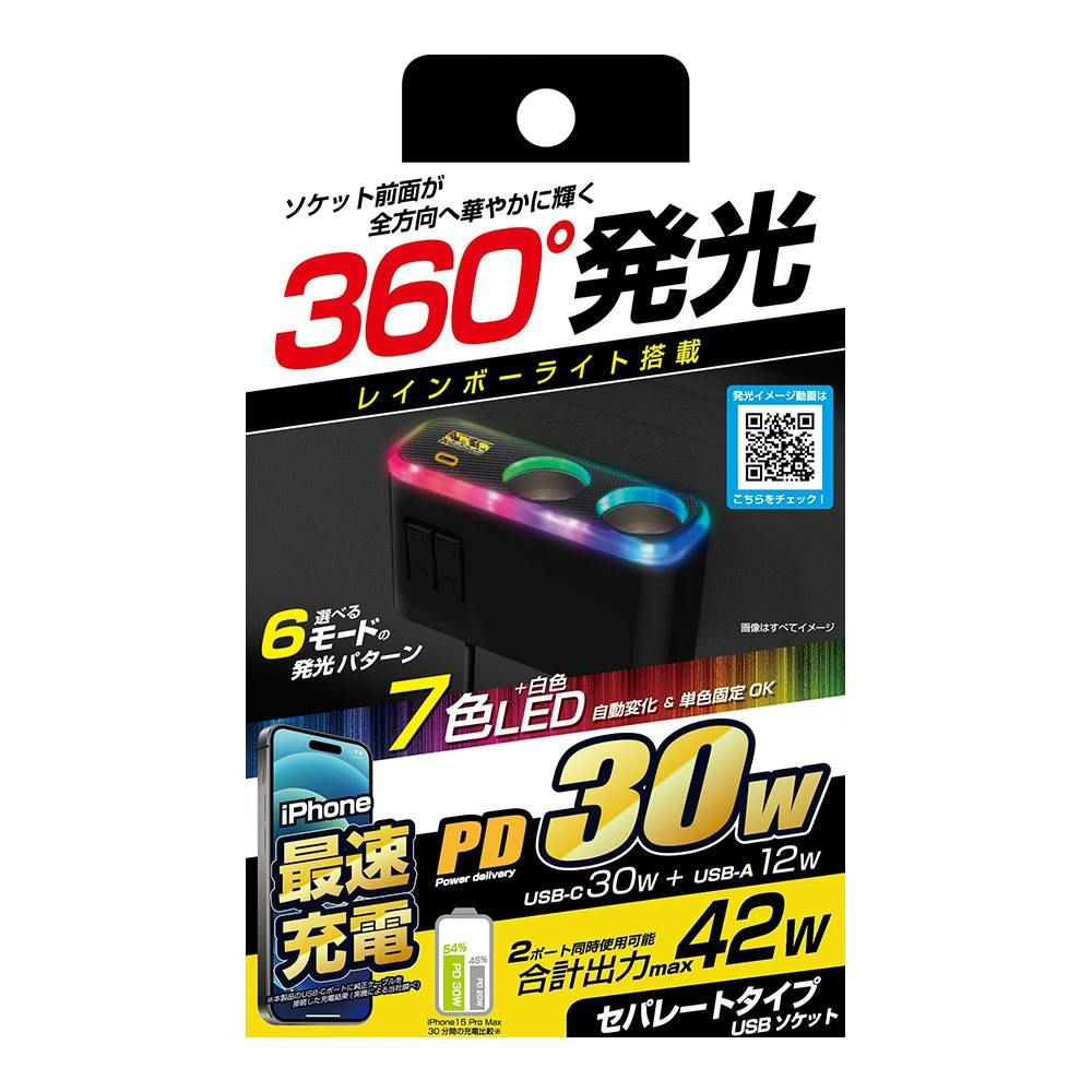 カシムラ 2連セパレートソケット PD30W リバーシブルUSB レインボーライト付き KX-244