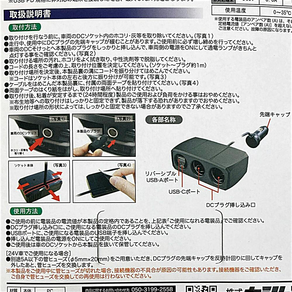 DCソケット最大72W(12V 6A/24V 3A)USB-Aポート最大12W(5V 2.4A)USB Type-Cポート最大30W(出力自動切替 12V 2.5A/9V 3A/5V 3A)
