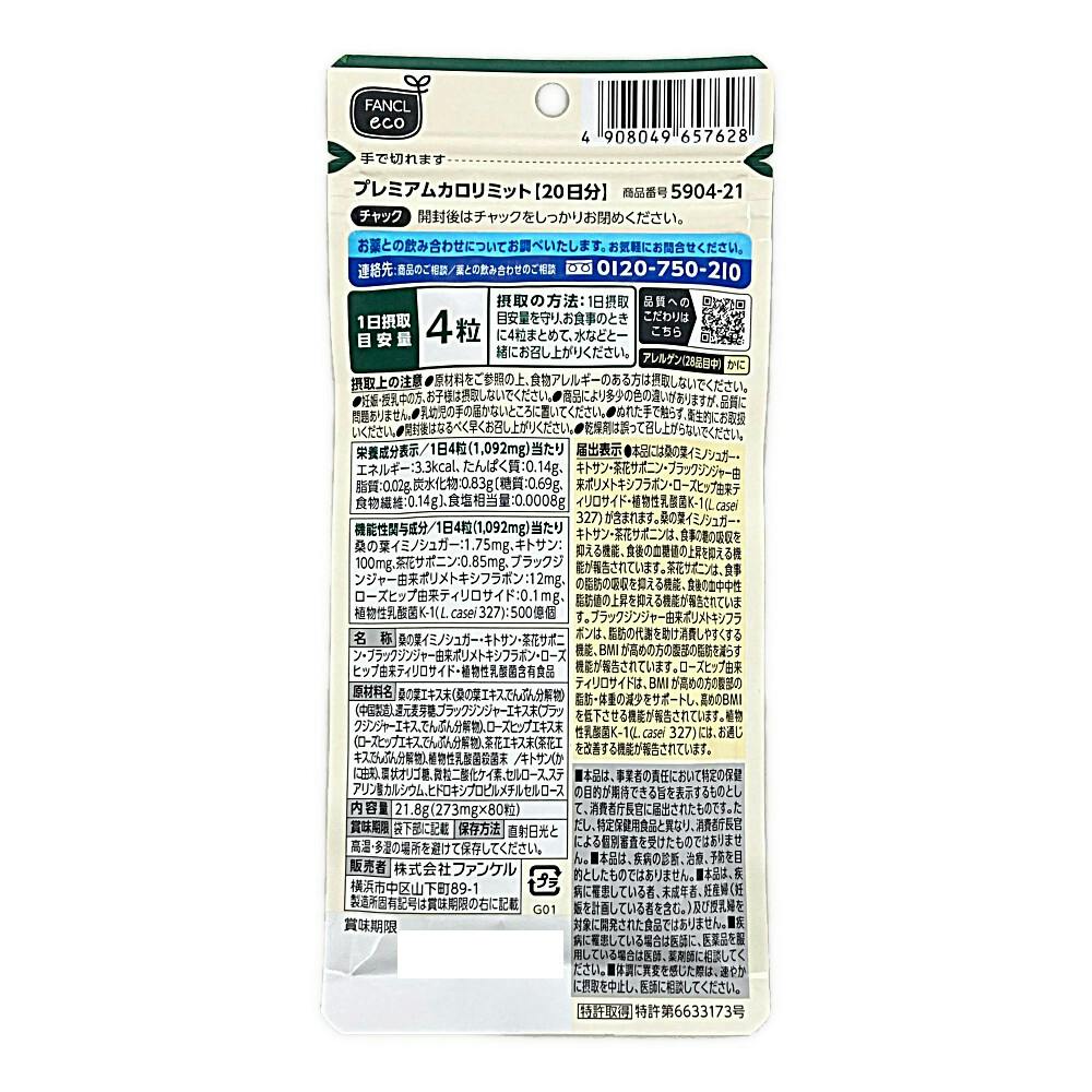 1日4粒(1,092mg)当たり/桑の葉イミノシュガー:1.75mg、キトサン:100mg、茶花サポニン:0.85mg、ブラックジンジャー由来ポリメトキシフラボン:12mg、ローズヒップ由来ティリロサイド:0.1mg、植物性乳酸菌K-1(L.casei327):500億個