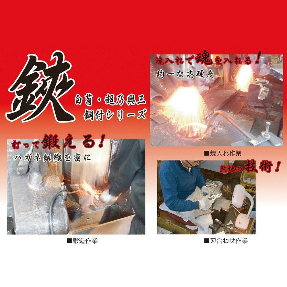 ●高級安来鋼を伝統鋼付製法で鍛えて作り上げた逸品です。最も重要な焼入れでは、極めて温度差の少ない2段階熱浴による焼入れ処理をしておりますので安定した高硬度と粘りを実現しております。●刃部は2層鋼付製法ですので刃研ぎが可能です。