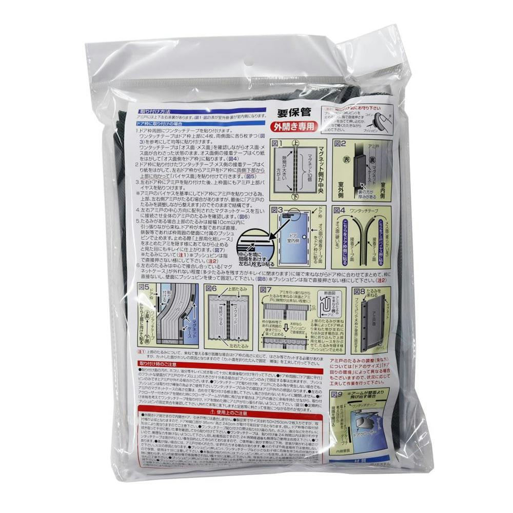 ●取付可能サイズ縦240cm×横95cmで、背の高いドアにも取付けが可能●アミ戸中央の開閉部分はマグネット効果で『パチッ!パチッ!パチッ!』と自然に閉まる●出入りは左右に広げる様にして簡単に行える●取り付けはワンタッチテープとプッシュピンで取付簡単
