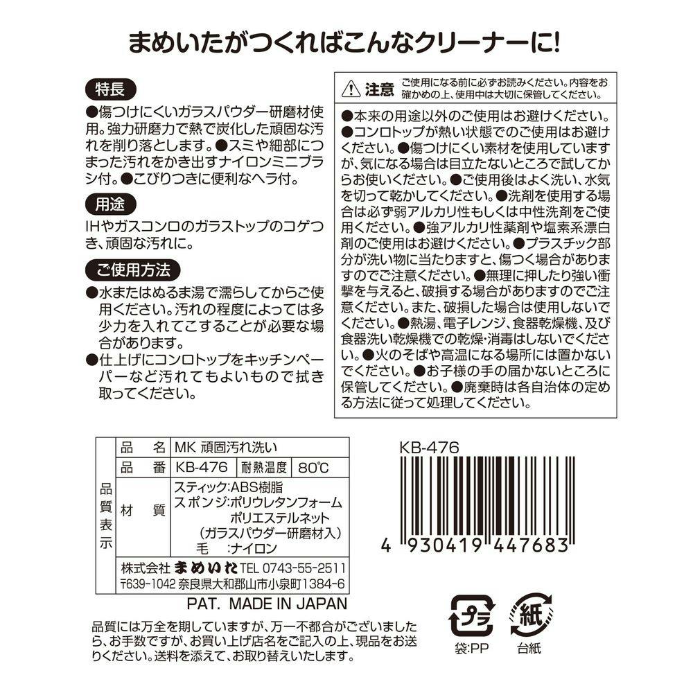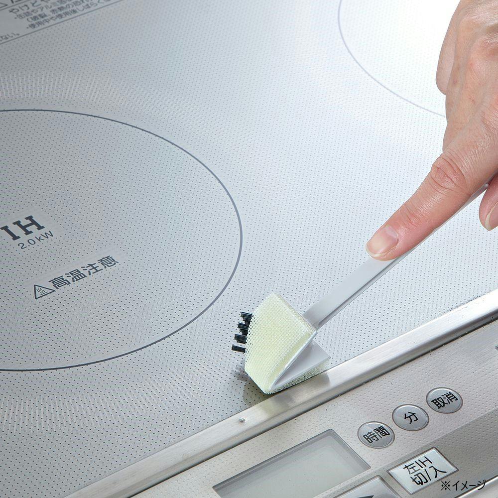 スポンジ表面にガラスパウダー研磨材を使用。強力研磨材で熱で炭化した汚れをしっかり落とします。隅っこはブラシでお掃除出来ます。