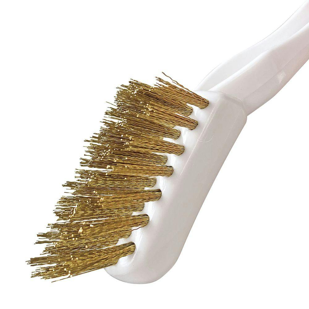真鍮毛を使用しているので、頑固なコゲつき・サビをかき落とします。先端の毛を斜めに植毛しているので、スミやみぞが磨きやすいブラシです。